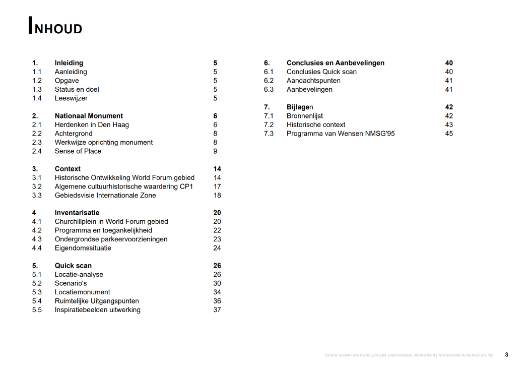 De gemeente Den Haag heeft opdracht gegeven voor een quickscan om een geschikte locatie te vinden nabij het voormalig Joegoslaviëtribunaal aan het Churchillplein. Deze quickscan onderzoekt de ruimtelijke mogelijkheden voor de oprichting van een monument en biedt aanbevelingen voor het ontwerp en de toekomstige ontwikkeling van het plein.