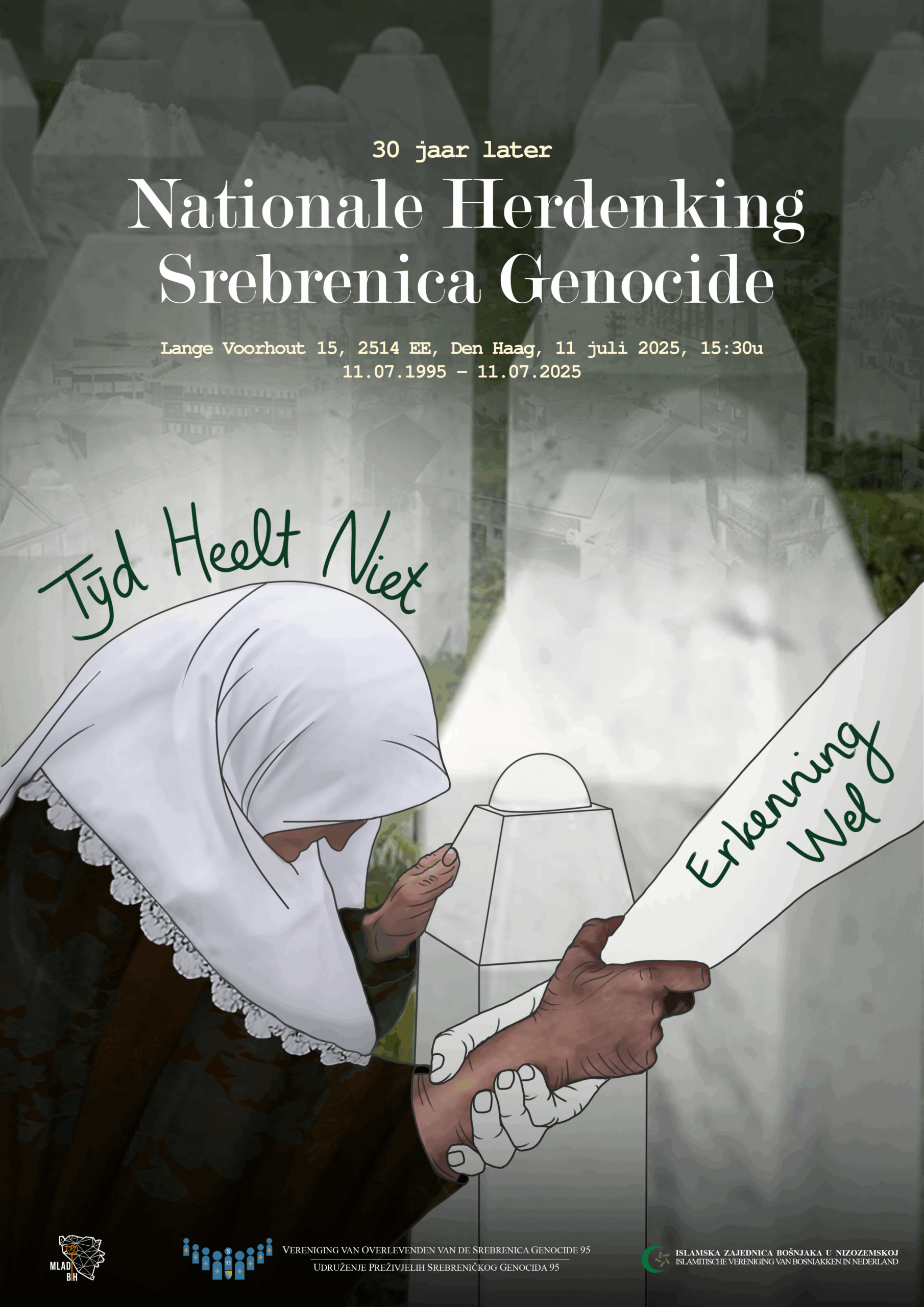 Bosanski – Nacionalna Komemoracija Srebreničkog Genocida u Den Hagu održava se svake godine 11. jula na Het Pleinu u Hagu, počevši od 1997. godine. Na ovaj dan odaje se počast više od osam hiljada žrtava genocida u Srebrenici. Ove osobe su poginule 1995. godine zbog radikalne nacionalističke srpske i bosansko-srpske agresije, nakon što je enklava, pod nadzorom UN-a, pala. Mnogi od njih još uvijek nisu pronađeni. Srebrenica i okolna područja su prekrivena masovnim grobnicama iz kojih se još uvijek vade ljudski ostaci, zatim se identifikuju i tek onda ponovo pokapaju na velikom groblju u Potočarima (Srebrenica). Kako bi se odala počast ovim ljudima i pružila podrška porodicama žrtava, Udruženje preživjelih genocida u Srebrenici, u saradnji sa IZBN, Mladi BiH i BiH Platformom, organizuje komemoraciju u Nizozemskoj na dan velike dženaze u Potočarima. I Vi ste srdačno pozvani da se pridružite!
