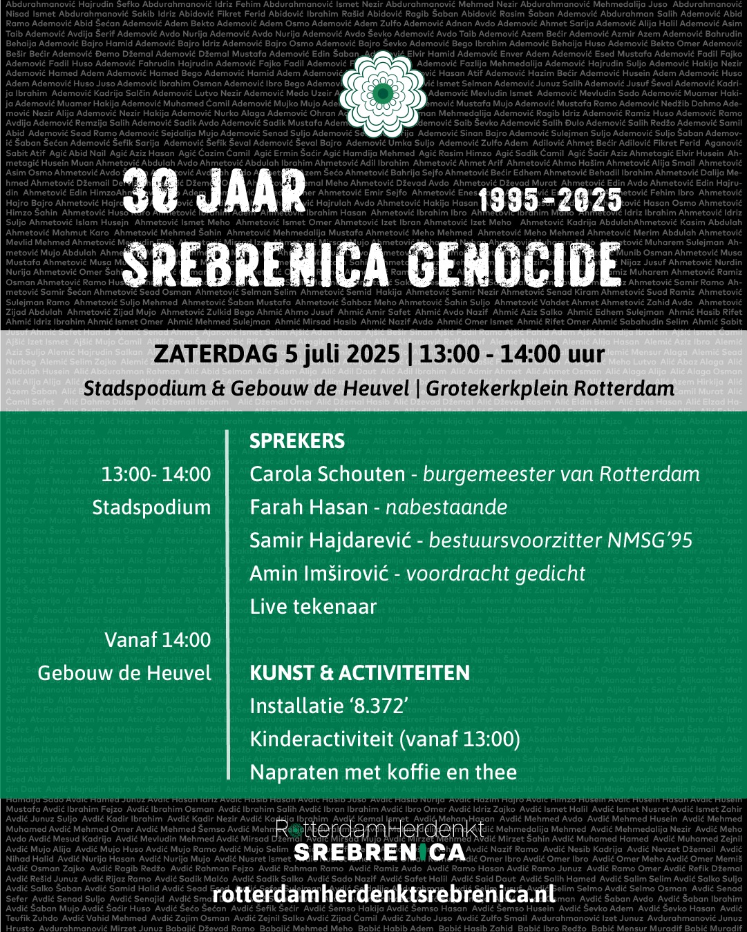 Nederlands – Sinds enkele jaren vindt er de zaterdag voor 11 juli, additioneel de lokale herdenking plaats in Rotterdam. In elke stad van ons land wonen Bosnische-Nederlanders. Stadsgenoten die de verschrikkelijke gebeurtenissen uit de jaren ’90 elke dag met zich meedragen. In elke stad is er nog grote onwetendheid over de genocide die in Srebrenica heeft plaatsgevonden, over de betrokkenheid van de internationale gemeenschap daarbij en de effecten van de genocide op de nabestaanden. Daarom willen we in Rotterdam, in aanvulling op en ondersteunend aan de nationale herdenking, de herinnering aan Srebrenica levend houden. Het centrale programma van de lokale Srebrenica Herdenking met toespraken, persoonlijke verhalen en kunstzinnige uitingen. De herdenking wordt geopend door burgemeester Carola Schouten. Ook is er een speciale plek waar kinderen stil kunnen staan bij het thema herdenken.